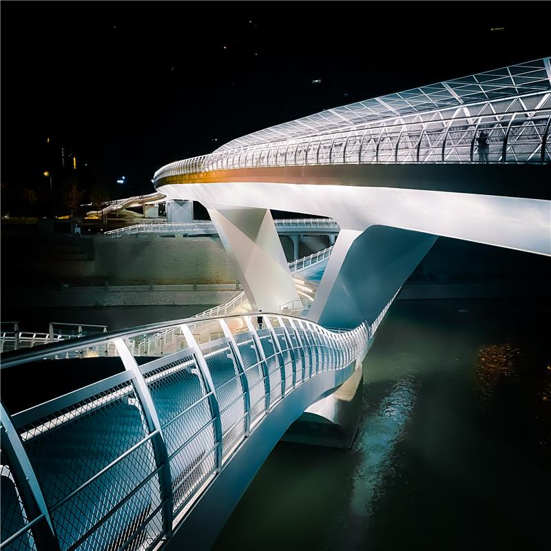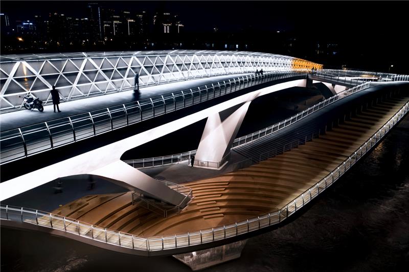 五岔子大桥在结构形式上分两幅桥:上游桥为主桥,下游桥为副桥,主、副桥间通过连接通道相接。主桥在上,坡度适宜,是连接两岸绿道可供自行车顺利通过的桥体;副桥在下,为步行道,有观河的环绕式剧场台阶,为市民提供别样的停留。