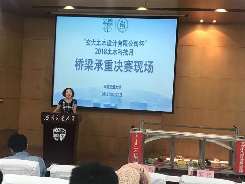 2018年5月20日,“交大土木设计有限公司杯”2018土木科技月桥梁承重、桥梁造型、虚拟桥梁竞赛在西南交大图书馆进入决赛阶段。作为在全国高校有影响力的大学生科创赛事,该活动得到了学校领导和我公司的重视和关注。公司总经理谢尚英应邀担任竞赛评委并致辞。